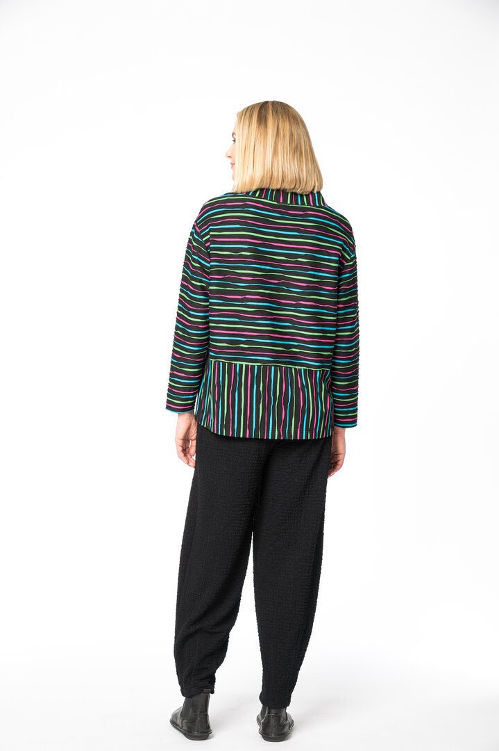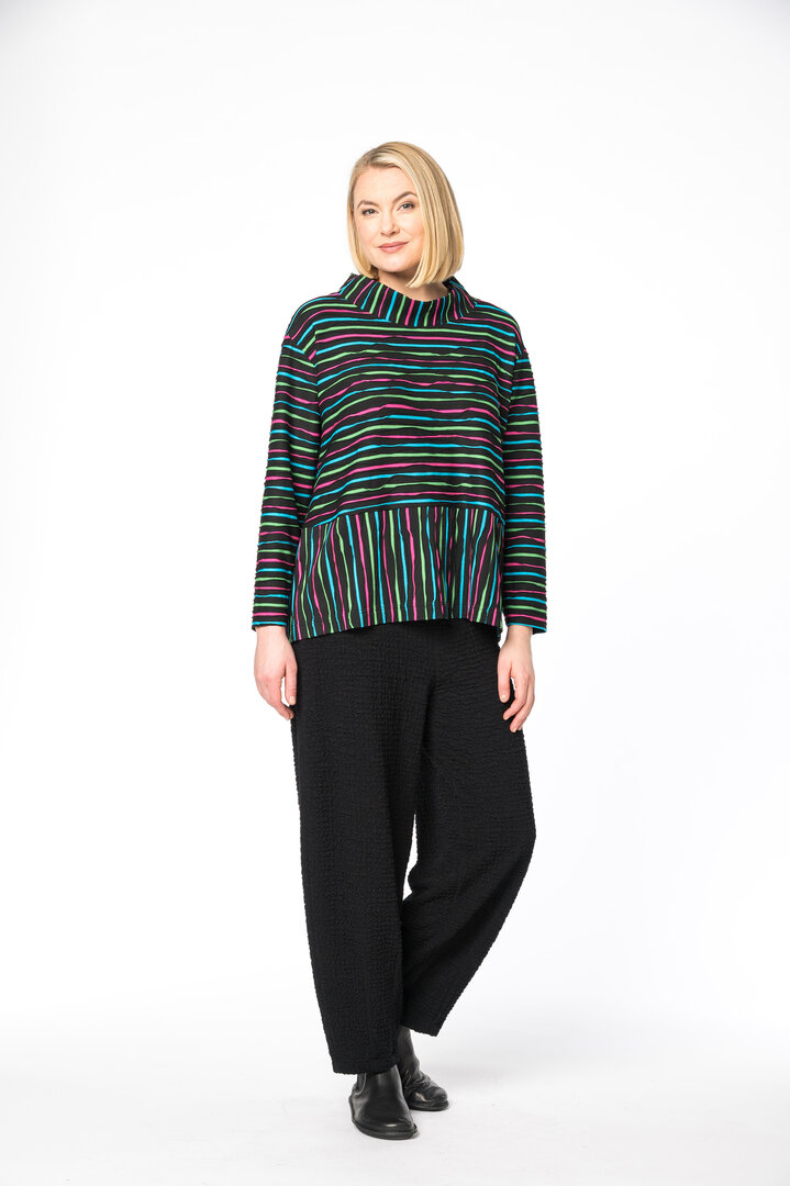 Diese kurze Tunika von Eve hat einen niedrigen Mühlsteinkragen und lange, schmale Ärmel. Dieser Stoff hat eine interessante grafische Streifenstruktur.