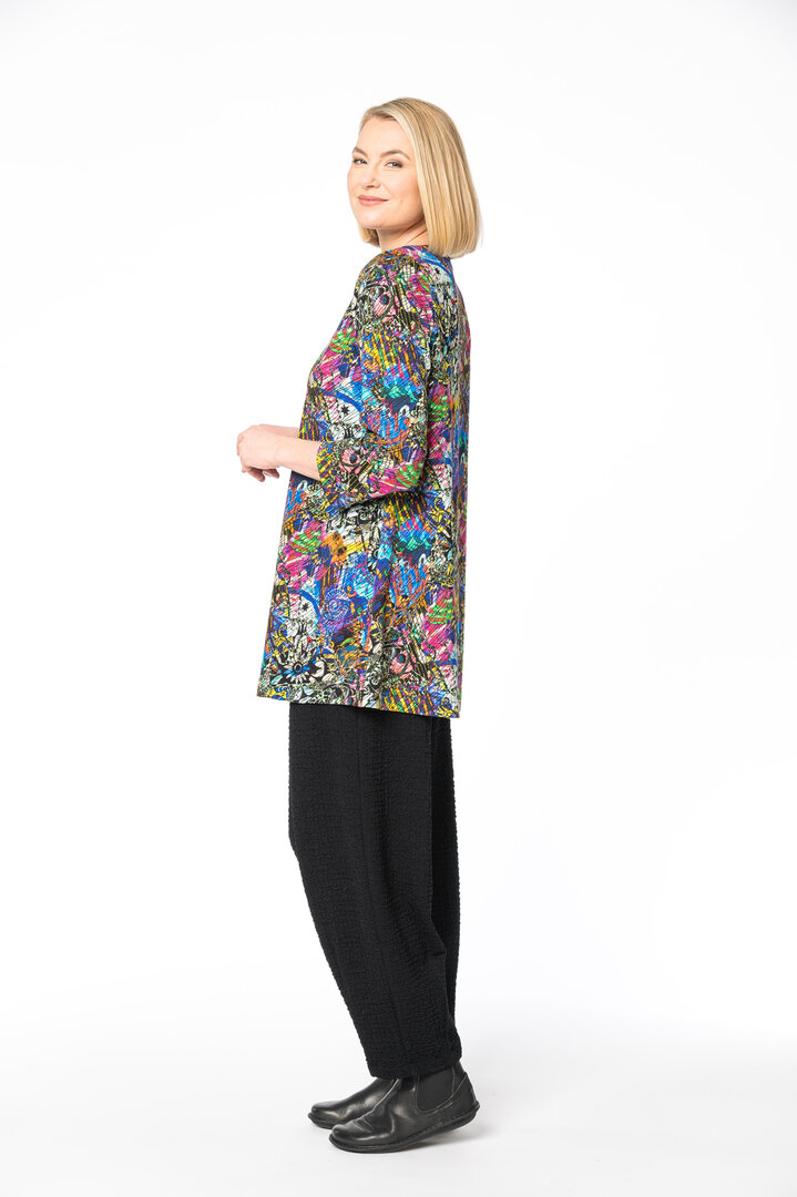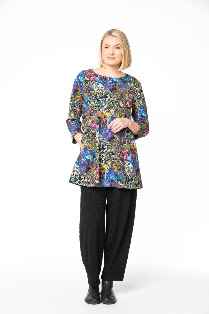 Die Pipsa-Tunika ist eine AINO-Basistunika mit einem etwas lockereren A-Linien-Stil. Es hat Seitentaschen und einen runden Bootsausschnitt. Deco ist ein lustiger, farbenfroher Druck aus einem Viskosemischgewebe.