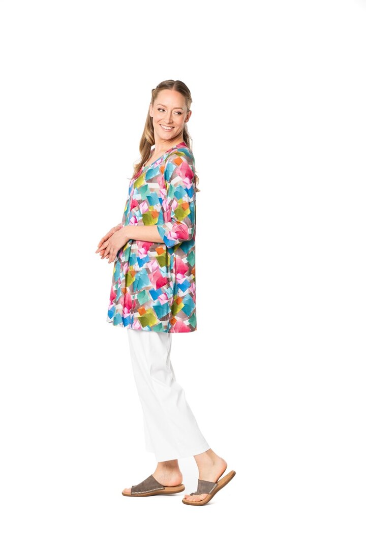 Tetta est une tunique courte et évasée. Elle présente une encolure ronde, des poches latérales et des manches ¾. Elle est confectionnée dans un jersey de viscose agréablement doux et fluide.