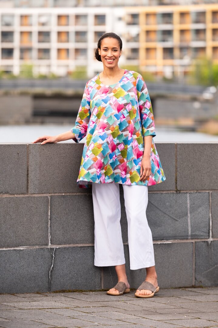 Tetta est une tunique courte et évasée. Elle présente une encolure ronde, des poches latérales et des manches ¾. Elle est confectionnée dans un jersey de viscose agréablement doux et fluide. Le moti  Lees meer..