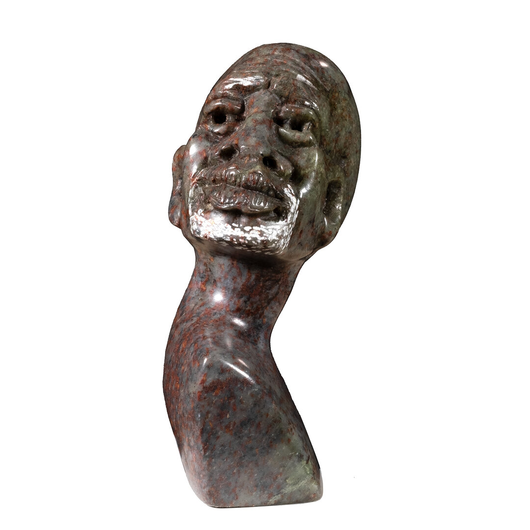 Dit stenen beeld van een Afrikaans hoofd straalt wijsheid en autoriteit uit en het oog voor detail is werkelijk waar onvoorstelbaar. Met alles is rekening gehouden, ogen, neus, oren, lippen en zelfs ouderdoms rimpels worden vertegenwoordigd in het beeld van het hoofd. Duidelijk is dat er een flinke studie aan vooraf is gegaan bij het maken van dit stenen beeld. Het beeld van het hoofd is gemaakt uit één stuk steen met bijzondere kleuraccenten, zoals groen, bruin en rood. Uniek aan dit beeld van het hoofd is dat het door één kunstenaar uit Zimbabwe is gemaakt, daarom zeggen wij ook altijd dat geen enkel beeld hetzelfde is. Op deze manier vertelt elk stenen beeld zijn eigen verhaal.
