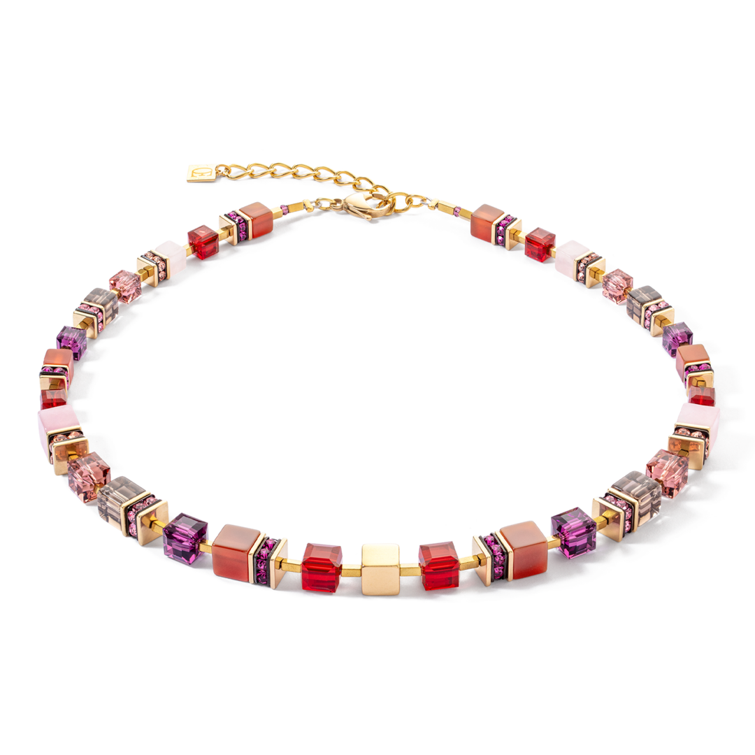 GeoCUBE® Precious Statement Ketting Goudrood: Feestelijke elegantie in rood De GeoCUBE® Precious Statement Ketting in goudrood is een indrukwekkend sieraad dat bij elke gelegenheid de aandacht zal trekken. Net als bij de hele Precious Statement-serie zijn de grote GeoCUBES® van hoogwaardige edelstenen en fonkelende Swarovski®-kristallen de blikvangers. Deze kostbare elementen zijn vakkundig zo gerangschikt dat ze naar achteren toe kleiner worden, waardoor ze comfortabel zitten. Een gouden roestvrijstalen kubus troont in het midden van de ketting, die het feestelijke rood van de kristallen perfect aanvult en het ontwerp een speciale diepte geeft. Deze ketting is de ideale keuze voor stijlvolle gelegenheden en voegt een vleugje glamour toe aan je look met zijn levendige rode kleur. De materialen van de ketting zijn Carneool, Rookkwarts, Rozenkwarts, Swarovski® Kristallen, Strass rondellen, Roestvrij staal goud. De sluiting is gemaakt van goud roestvrij staal. De lengte van de ketting is 45 cm + 6 cm verlenging. Elk sieraad dat u bij COEUR DE LION bestelt, wordt mooi opgemaakt op een stukje satijn in een premium designer etui en met een echtheidscertificaat aan u geleverd.