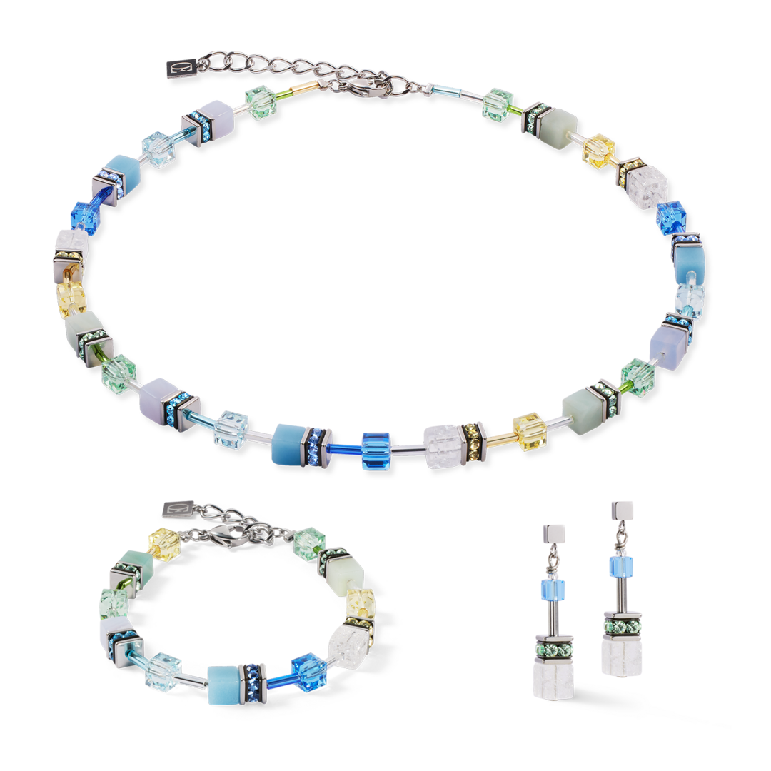 Fris, modern en expressief - de GeoCUBE® Iconic Precious oorbellen aquagroen brengen de verfrissende kleuren van amazoniet, chalcedoon en bergkristal tot leven. Gefacetteerde Swarovski® kristallen kubussen versterken het glinsterende effect, terwijl zilverkleurige roestvrijstalen elementen een koele, moderne touch toevoegen. Een elegant sieraad met een vleugje lichtheid. Deze oorbellen zijn gemaakt van Bergkristal, Swarovski® kristallen, Strass-rondellen, Roestvrij staal. De lengte van de oorbel is 3,2 cm. De oorknopjes zij gemaakt van roestvrij staal. Elk sieraad besteld bij COEUR DE LION wordt u geleverd op een zijden bed in een premium designkoffer en met een certificaat van echtheid.