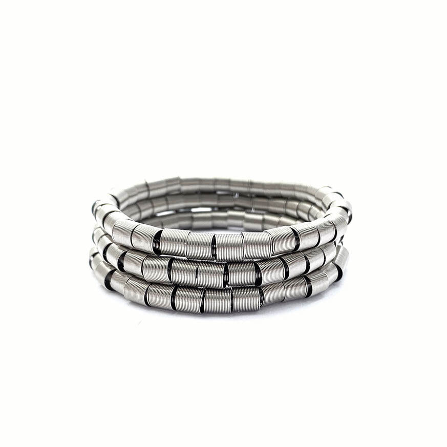Drie losse armbanden van La Molla met bijzonder ontwerp van roestvaste stalen veren, gebaseerd op Afrikaans design. Lees meer..