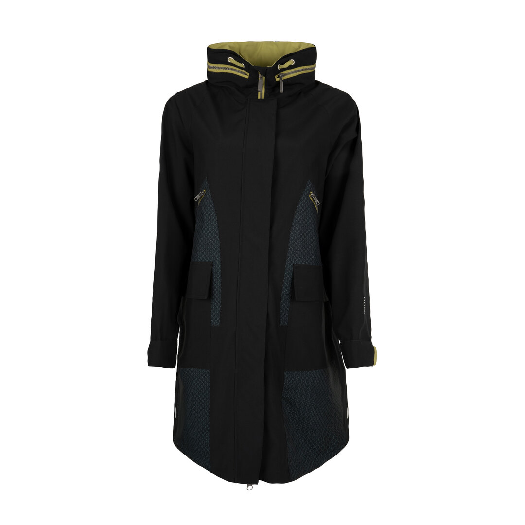 Het weer is een grote inspiratiebron geweest voor de ontwikkeling van dit functionele kledingstuk voor regenachtige, winderige dagen. Deze stof is zeer technisch, maar voelt toch zeer comfortabel aan.